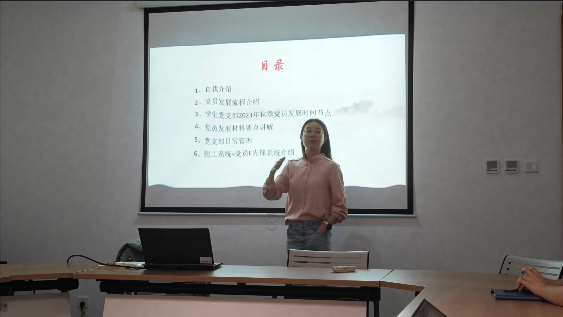 此后,由硕士第四研究生党支部的郑思宇同志为大家讲解发展党员各个阶段所需要的材料,并希望新任党支委认真阅读发放的相关材料,更好地完成支部工作任务。接着,由硕士第四研究生党支部的宋澳华同志为大家补充介绍支部日常管理的相关内容,具体介绍了组工系统和党员E先锋系统的使用方式和日常维护流程,包括收缴党费、党组织转入转出等系统操作方式,同时宋澳华同志也将自己身为前支部书记的宝贵经验传授给大家,在座各位都感到受益匪浅。