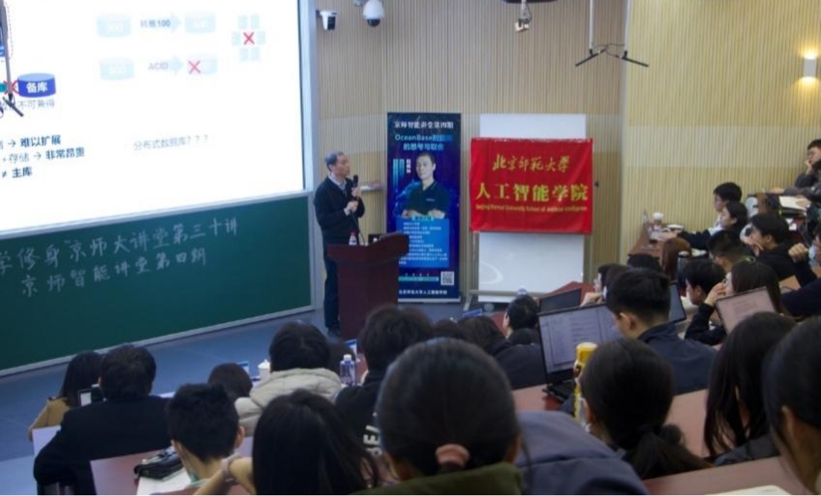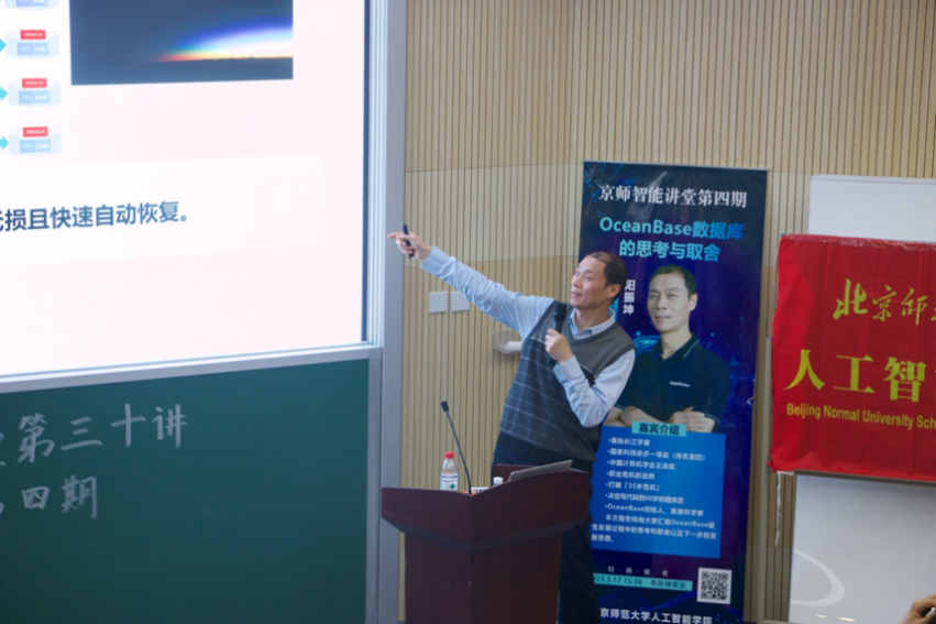 2023年3月17日,京师智能讲堂第四期在电阶梯教室如期举行,活动由黄色网站 党委学生工作部与黄色网站 主办。本次讲座邀请了现任蚂蚁集团副总裁、OceanBase公司首席科学家阳振坤教授做题为“OceanBase数据库的思考与取舍”的学术报告。同学们积极参与本次讲座,全场座无空席,来自人工智能、数学、统计等各个专业的学生都对OceanBase的技术和发展前景表现出极大的兴趣,同学们争先恐后踊跃提问,气氛十分热烈。