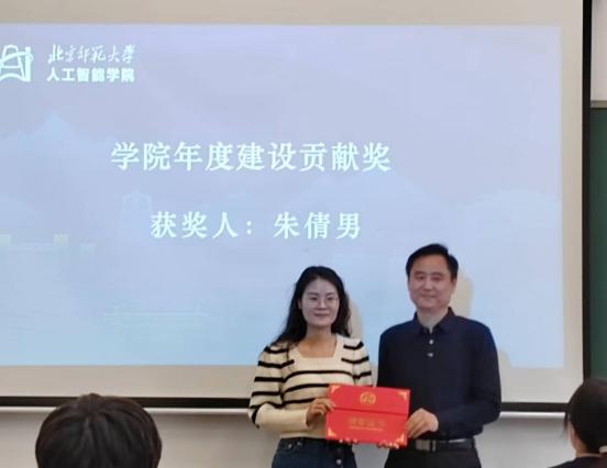 随后,杨学玉书记肯定了全体教职工在过去一年的辛勤工作和突出成绩,公布了获得学院2023年建设贡献奖的5位教师名单,这几位老师在学院算力平台建设、学生信息素养提升、培养方案修订及实践平台建设、学院搬迁、教育大模型研究等方面做出了代表性贡献。黄华院长以姓氏拼音为序向樊亚春、郭宇、计卫星、余乐军、朱倩男等5位教师颁奖,获奖教师分别发表获奖感言。